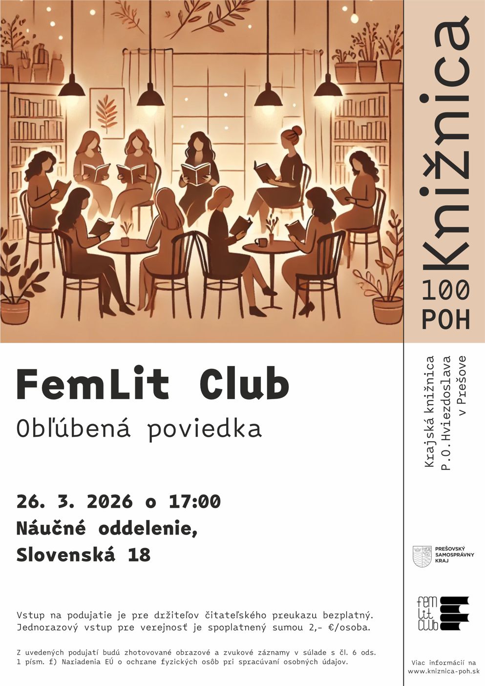 Zaujíma Vás feministická literatúra? Radi o knihách nielen čítate, ale aj diskutujete? Ak ste odpovedali v oboch prípadoch pozitívne, pridajte sa k nám na ďalšom stretnutí FemLit Clubu, ktorý sa uskutoční vo štvrtok 26. marca 2026 o 17:00 hod. v priestoroch Náučného oddelenia krajskej knižnice (Slovenská 18).