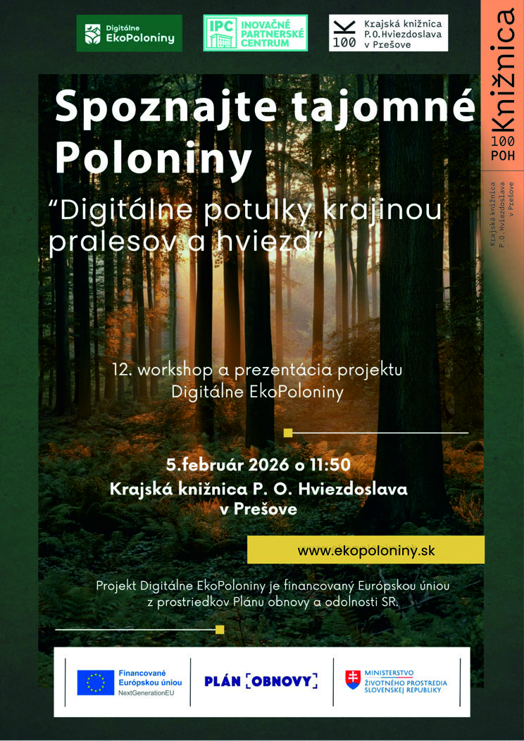 Vyberte sa s nami na digitálne potulky krajinou pralesov a hviezd. Podujatie Spoznajte tajomné Poloniny je súčasťou projektu Digitálne Eko Poloniny. Stretnutie sa uskutoční 5. februára o 11:50 na Náučnom oddelení knižnice (Slovenská 18).