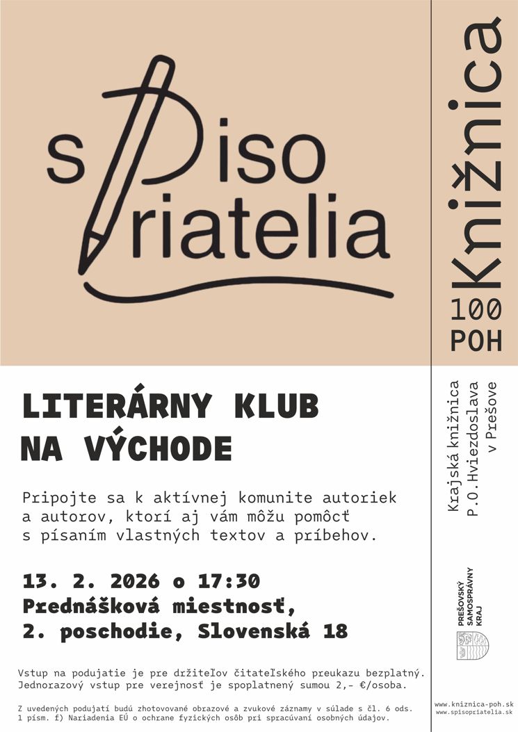 Radi tvoríte, píšete príbehy či texty a túžite sa v tom zlepšiť? Chceli by ste, aby sa na Vašu tvorbu pozrel skúsený autor a poskytol Vám spätnú väzbu? Potom neváhajte a príďte medzi nás. Pozývame Vás 13. februára 2026 o 17:30 do Prednáškovej miestnosti na 2. poschodí (Slovenská 18). Čaká Vás inšpiratívne stretnutie s aktívnou komunitou autoriek a autorov, ktorí si navzájom pomáhajú rásť a zlepšovať svoje písanie.