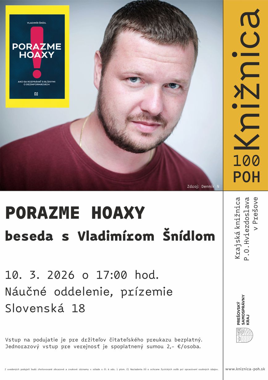 Vladimír Šnídl sa po troch rokoch vráti 10. marca 2026 do krajskej knižnice, aby čitateľom a verejnosti predstavil svoj druhý knižný titul, ktorý vyšiel minulý rok. Tento slovenský novinár sa venuje problematike šírenia hoaxov a dezinformácií a patrí medzi zakladajúcich členov Denník N. Účastníkom autor ponúkne aj praktické tipy, ako sa rozprávať s blízkymi, ktorí veria dezinformáciám - a to dezinformáciám z rôznych táborov. Začiatok besedy je naplánovaný na 17.00 hod.