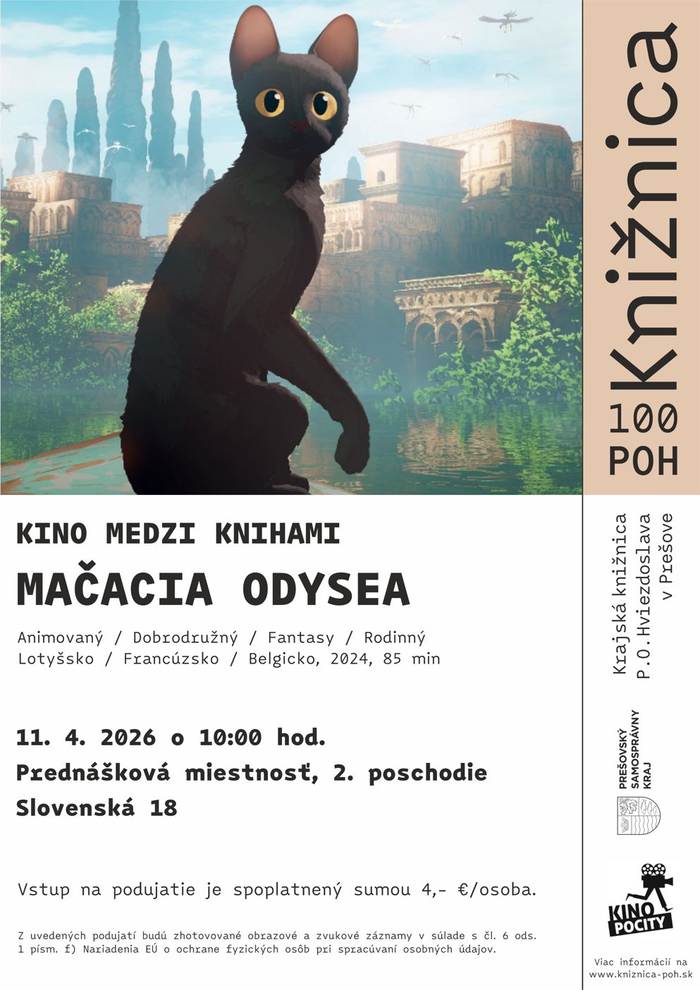 Milí malí aj veľkí čitatelia. Pozývame najmenších aj s ich rodinami stráviť do krajskej knižnice príjemné sobotné dopoludnie, ktoré bude sršať rozprávkovou atmosférou. V sobotu 11. apríla 2026 od 10:00 hod. privítame záujemcov v Prednáškovej miestnosti na 2. poschodí, kde premietneme zvieraciu rozprávku Mačacia odysea. Vstup na podujatie je 4,- €/osoba. Tešíme sa na stretnutie s vami všetkými.
